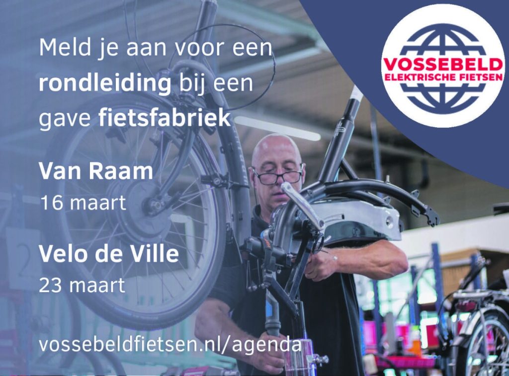 Op 16 maart gaan we naar de fabriek van Van Raam in Varsseveld. Van Raam maakt aangepaste fietsen zoals driewielers, duofietsen, tandems, et cetera. Er is veel animo, de rondleiding is al bijna volgeboekt. Op 23 maart bezoeken we Velo de Ville in Altenberge. Daar worden luxe elektrische fietsen naar klantwens gemaakt. Je ziet daardoor in de fabriek alle kleuren en uitvoeringen door elkaar, en toch gaat dat goed. Er zijn nog een aantal plekken vrij. Opgeven kan via telefoon, mail of de website van Vossebeld. Plekken zijn beperkt.