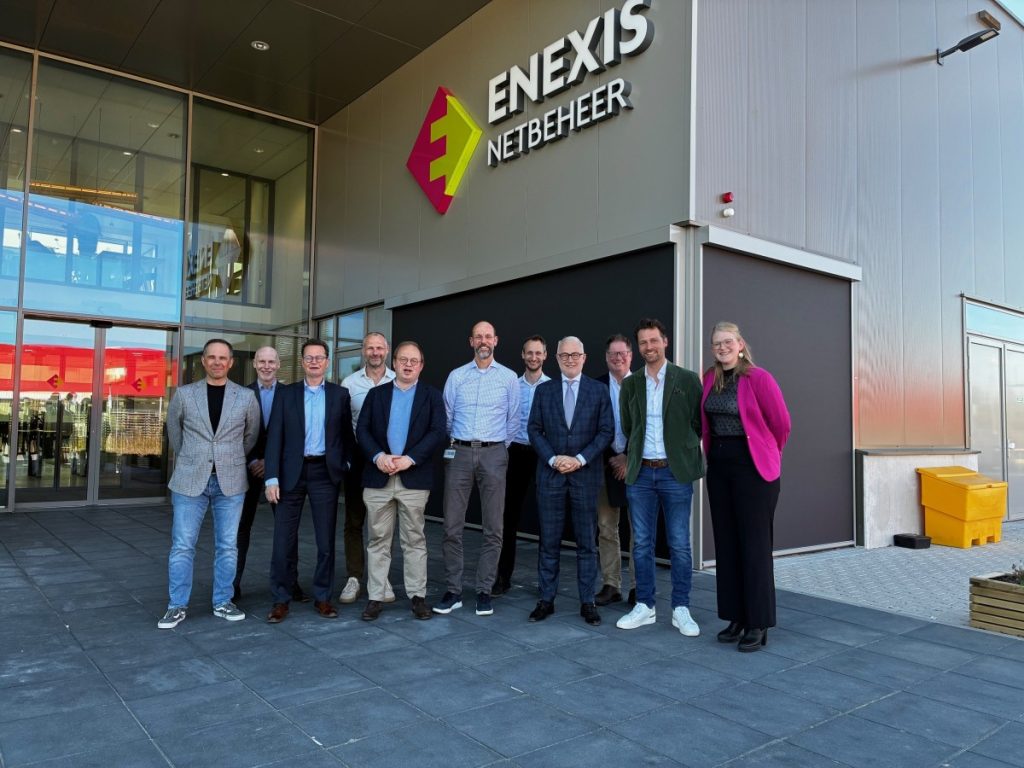 Foto: Het college van B&W, enkele Haaksbergse ambtenaren en medewerkers van Enexis voor het bedrijf in Hengelo.