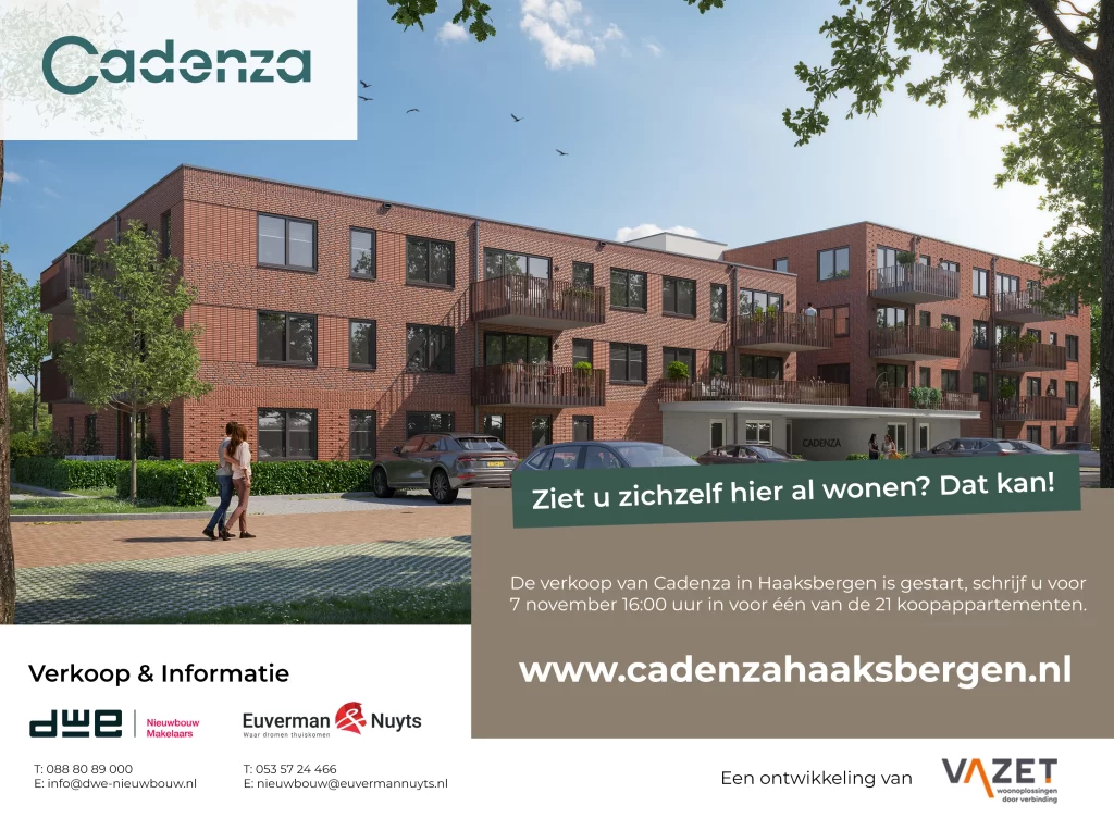 De verkoop is gestart en de belangstelling is groot. Inschrijven kan tot 7 november om 16:00 uur via www.cadenzahaaksbergen.nl. Daar vindt u ook alle verkoopinformatie, zoals prijzen, brochure en plattegronden.