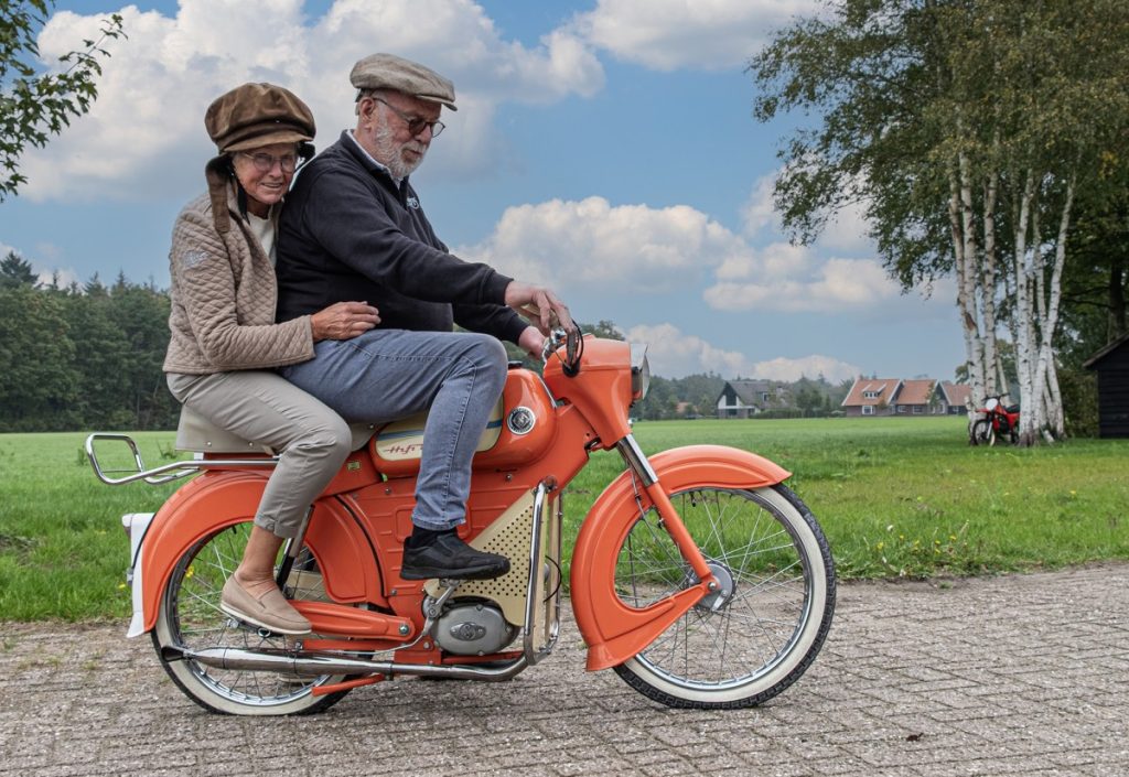 “Ruim 60 jaar na hun verkeringstijd gingen Bennie en Hermien in het kader van een film- en fotoproject opnieuw “brommers kiek’n”. Bennie als verwoed verzamelaar van bromfietsen had daarvoor het juiste model. De foto paste volgens mij perfect bij het thema van de Foto van de Maand: “Mijn Generatie”. Dit is tevens het thema van de Boekenweek. Wilt u alle inzendingen bekijken, ga dan even naar onze website: Fotogroep Haaksbergen”.