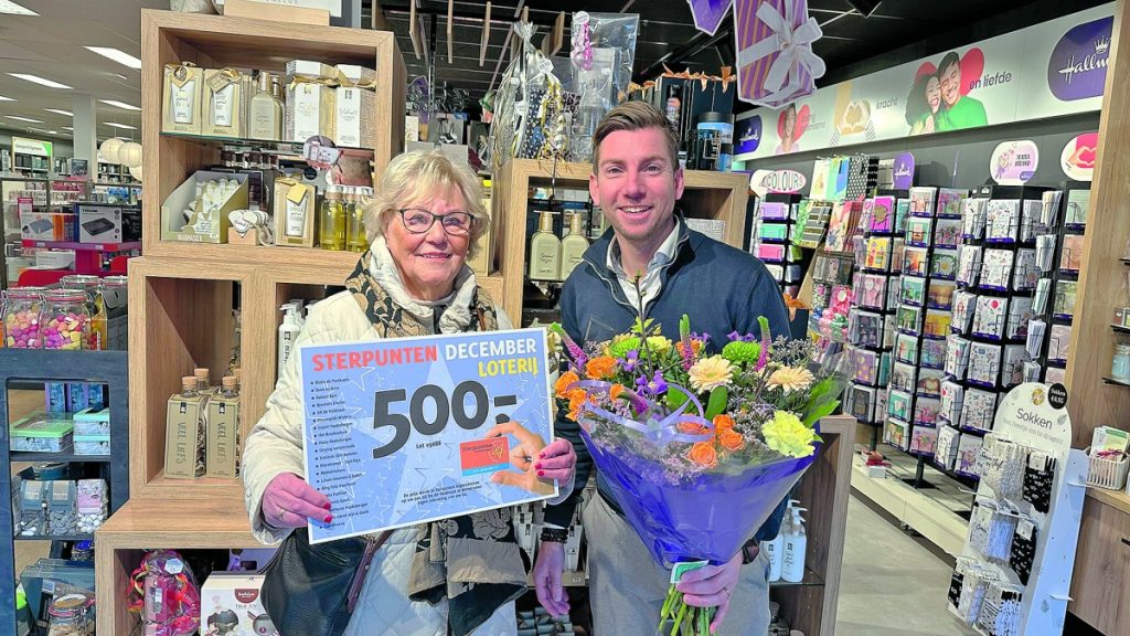 HAAKSBERGEN – Hilde Monnikhof glundert. En dat is niet zo raar na het goede nieuws pasgeleden van stichting Sterpunten. De inwoonster van Haaksbergen won 500 euro bij de loterij van Sterpunten in de laatste maand van vorig jaar. Namens stichting Sterpunten boden voorzitter René Bult en secretaris Peter Verzijde haar vlak voor het weekeinde een cheque ter waarde van 500 euro aan. Dat bedrag kan ze verzilveren bij een van de deelnemende winkels van Sterpunten. “Ik ga daarmee naar Electro Breukers in de Veldmaat om daar iets te kopen. Daar ben ik vaste klant”, zegt Monnikhof, die ook nog een bos bloemen ontving bij de prijsuitreiking. De cheque en de bloemen zijn overhandigd in de Marskramer aan de Spoorstraat, een van de deelnemende winkels van Sterpunten. “Sterpunten vind ik een heel goede actie. Het is fijn om in Haaksbergen inkopen te doen. Hier is alles mooi compact in het centrum. Daarom kom ik hier graag naar de winkels”, zegt Monnikhof, die voor haar verhuizing jarenlang in Enschede heeft gewoond. Het winnende lot kreeg ze bij de aankoop van een paar handschoenen bij Takko. Maar op dat moment wist ze uiteraard nog niet dat ze als winnaar van 500 euro uit de bus zou komen. De trekking was pasgeleden. Monnikhof zag haar winnende lotnummer in weekblad Rond Haaksbergen. Zesentwintig prijzen zijn er in totaal. “Die variëren van 20 tot 750 euro. De hoofdprijs is 750 euro, maar de eigenaar van het winnende lot heeft zich nog niet gemeld. Dat kan nog tot de laatste dag in februari”, zegt Bult. Deze eindejaarsloterij van Sterpunten was een groot succes met zo’n 10.000 loten. Kopen met de Sterpuntenkaart loont en kan dus ook nog een mooie prijs opleveren. Ook dit jaar wordt er weer een loterij van Sterpunten georganiseerd, zo laat de organisatie weten.
