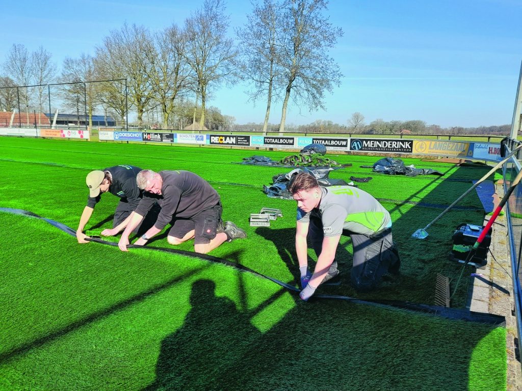 De werkzaamheden zijn vorige week maandag begonnen. Uiterlijk volgende week vrijdag moet het nieuwe veld speelklaar zijn. “Op zaterdag 14 maart zijn de eerste jeugdwedstrijden op het nieuwe hoofdveld en een dag later op zondag 15 maart is er de thuiswedstrijd tegen vv Haaksbergen”, zegt voorzitter Wilfried ter Braak van Hoeve Vooruit. Met de derby tegen vv Haaksbergen wordt de nieuwe kunstgrasmat officieel geopend. Het duel begint om 14.00 uur. Na afloop is er ook feest in de kantine met muziek. De kunstgrasmat bij Hoeve Vooruit was na bijna vijftien jaar aan vervanging toe. “Dat was onze eerste kunstgrasveld”, zegt Ter Braak. Het nieuwe kunstgrasveld wordt aangelegd door het bedrijf Rolugro uit Groenlo. “Wij leggen ongeveer dertig kunstgrasvelden per jaar aan. Dat doen we ook veel in Duitsland”, zegt Nick Oude Luttikhuis (rechts) van Rolugro. Na het verwijderen van de oude mat is eerder deze week een begin gemaakt met de aanleg van de nieuwe mat. Grote rollen werden uitgerold op de ondergrond. Hoeve Vooruit kan tijdens het seizoen dus enkele weken niet op het eigen hoofdveld voetballen, Daarom is het thuisduel afgelopen zondag tegen Rood Zwart bij Rood Zwart in Delden gespeeld. Uitslag 0-0.