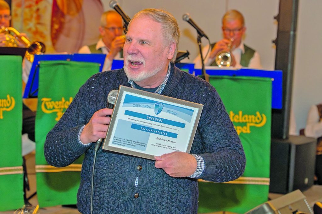 André van Huizen werd benoemd tot erekapelmeester van de Twentelandkapel, onderdeel van muziekvereniging Crescendo Buurse en Marcel overhandigde hem een oorkonde met een attentie.