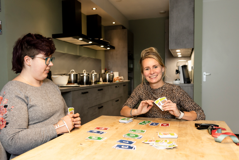 Rebecca (links op de foto): “Begeleid wonen gaat niet alleen over serieuze gesprekken, maar juist ook over samen lachen en genieten van de gezellige momenten”. Marlie (rechts op de foto): “Dat ervaar ik ook zo. Juist door samen alledaagse, huiselijke dingen te doen, vergeet je soms dat het werken is”.