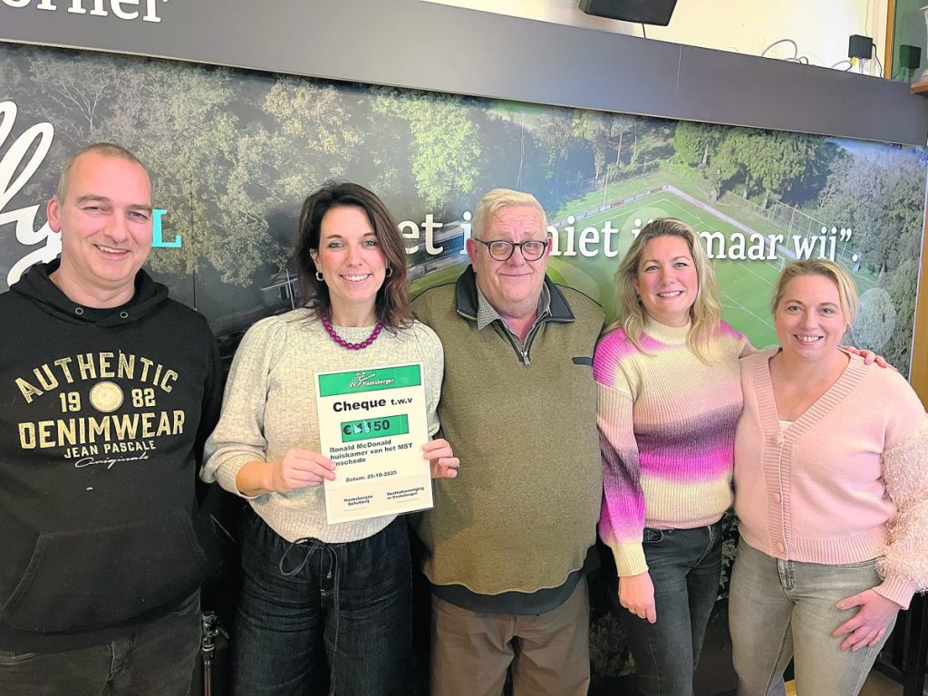 HAAKSBERGEN – Johan Diepenmaat heeft weer een mooie bijdrage geleverd aan het goede doel met zijn toiletfooi tijdens de Schuttersfeesten begin september. Voor de Ronald McDonald Huiskamer van het MST haalde hij maar liefst 1150 euro op. Dat bedrag overhandigde hij zaterdag hoogst persoonlijk aan de twee coördinatoren Jolien Leussink (links) en Heleen Schöppink. ”Er komt een logeerkamer naast de huiskamer van het MST en daar kunnen we deze gift heel goed voor gebruiken.” Vorig jaar maakte Johan Diepenmaat de Stichting Opkikker blij. Dit keer koos de materiaalman van VV Haaksbergen voor de Huiskamer van het MST. Hij overhandigde de cheque in de kantine van zijn eigen voetbalclub op het Scholtenhagen en de ontvangers lieten weten een mooie bestemming voor het bedrag te hebben. ”Het MST heeft nu bijna 5 jaar een Ronald McDonald Huiskamer en daar maken zo’n duizend gasten per maand gebruik van. We hebben gemerkt dat er behoefte is aan slaapplekken en die gaan we naast de Huiskamer ontwikkelen”, leggen Jolien en Heleen uit. De Huiskamer heeft waarde de afgelopen jaren meer dan bewezen, hebben de dames mogen ervaren. ”Het biedt ouders van kinderen in het ziekenhuis de mogelijkheid om zelf tot rust te komen en toch dicht bij hun kind te zijn. Er ontbrak nog een logeergelegenheid en die zijn we nu aan het ontwikkelen.” Daarmee is het MST de eerste Huiskamer die zo’n logeergelegenheid krijgt. ”Mede dankzij deze gift van Johan. Want de Huiskamer bestaat van giften en donaties.” VV Haaksbergen heeft het bedrag overigens aangevuld en de Haaksbergse Schutterij heeft dat bedrag nog eens verdubbeld. Ook Bianca van de Weiden (VV Haaksbergen) en voorzitter Alfons Waanders van de Haaksbergse Schutterij (foto) waren bij de overhandiging aanwezig.