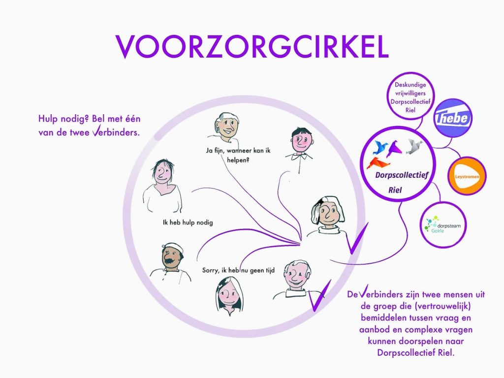 Het gaat vooral over omkijken naar je oudere buur. In het kort:  “Je buurvrouw zou bijvoorbeeld kunnen vragen om de afvalton een keer aan de straat te zetten of de babyfoon te hebben. In een voorzorgcirkel gaat dat een stapje verder”, legt Joep Oude Groen van de Seniorenalliantie uit. ”Je maakt duidelijke, concrete afspraken over de manier waarop je voor elkaar klaarstaat in de straat en je stemt af hoe je elkaar kunt helpen. Dit doe je vrijwillig, maar wel met een serieuze inzet.”