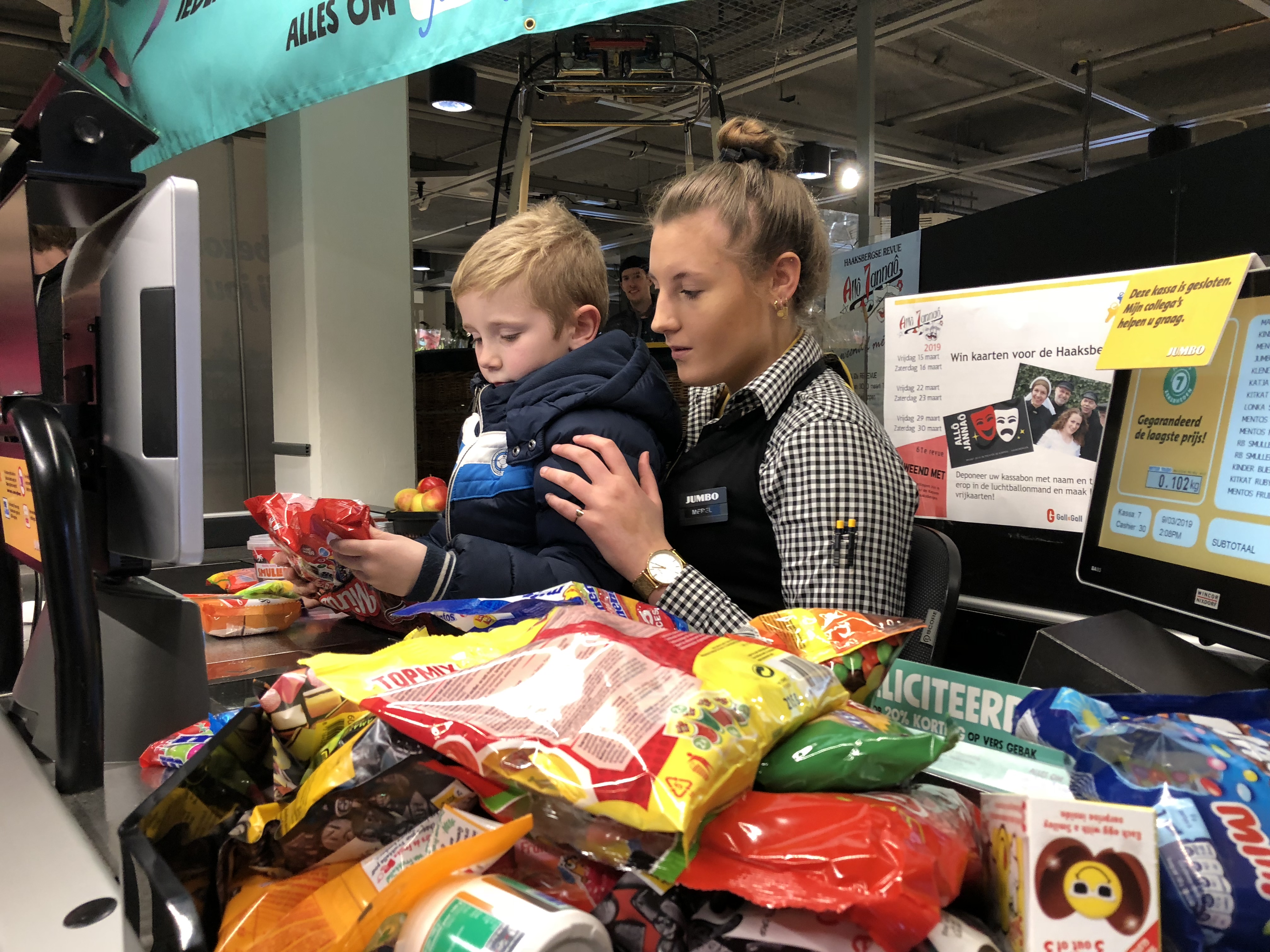 Hij mocht bij Jumbo aan de Spoorstraat 1 minuut zoveel snoep pakken als hij maar kon.