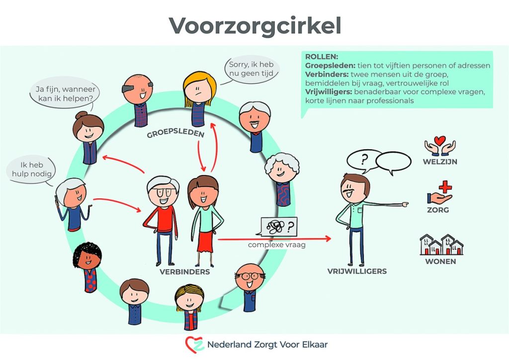 Voorzorgcirkels worden – het woord zegt het al – uit voorzorg gevormd. Als je concrete afspraken hebt met buurtgenoten, wordt hulp vragen van buren laagdrempeliger. ”Je hoeft dan niet meer na te denken wie er een boodschap voor je haalt als je ziek in bed ligt.”